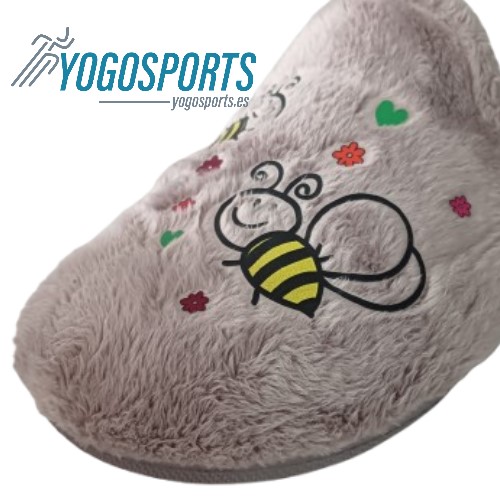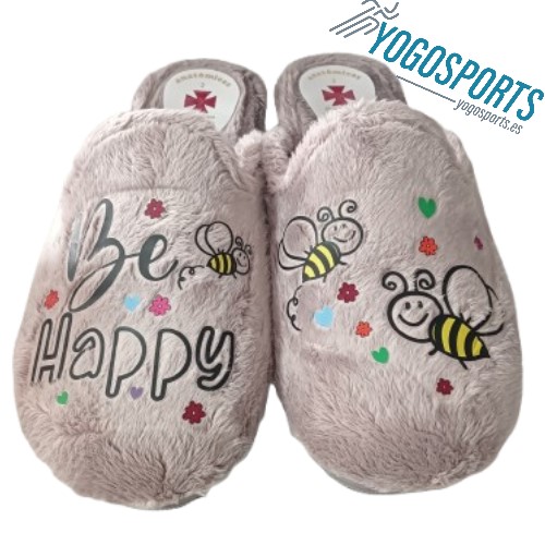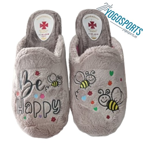 Zapatilla abierta con puntera cerrada de invierno para mujer en beige oscuro de estar en casa, modelo 60053 de la marca Calzarella, fabricadas en suapel, un tejido suave y abrigado para mantener el pie caliente, con imagen de abejas en el pie izquierdo y mensaje de «Ser Feliz» en ingles en el pie derecho, forro interior y planta en suapel, pelo suave, suela de goma antideslizante para mayor agarre y hechas en España, calidad garantizada, las mejores zapatillas de casa, las más originales, mas confortables y mas apropiadas para estar cómoda.