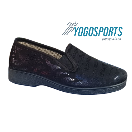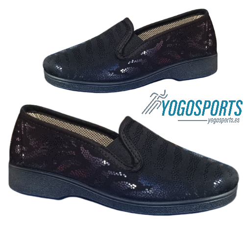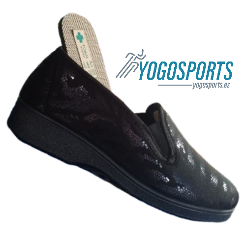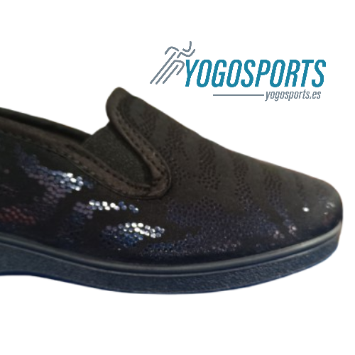 Zapatilla de calle para mujer de la marca Campello con un ancho especial, una zapatilla con una horma terapéutica diseñada por podólogos para cuidar de tus pies, perfecta para dar largos paseos sin roces ni presiones, está elaborada en textil, una licra muy suave, transpirable y flexible que se adapta como un guante al pie, en color negro con unos sutiles detalles en brillo, perfectas para que las combines fácilmente, se ajustan de manera perfecta y permiten un calce rápido y cómodo gracias a los elásticos en el empeine, además, su plantilla System Foam extraíble no solo aporta una pisada acolchada, sino que también permite ventilar el interior o colocar una plantilla personalizada cuando lo necesites, suela de caucho antideslizante y flexible que acompaña el movimiento natural, convirtiéndolas en las aliadas perfectas para tu día a día.